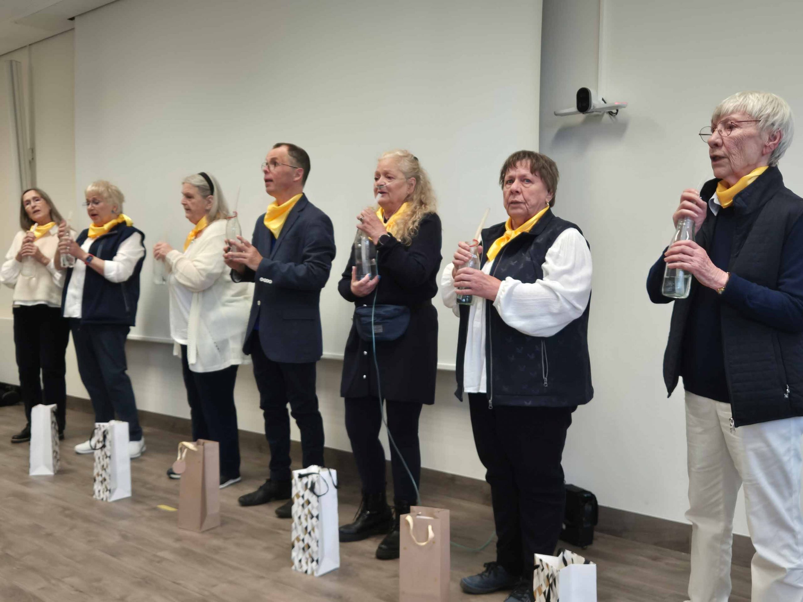 Dr. Natascha Wehnert, Oberärztin in der Abteilung Gastroenterologie, referierte sehr anschaulich über die Leber, die als häufig betroffenes Organ auf keinen Fall vergessen werden sollte. Hier stellte sie u.a. neben dem bekannten APRI-Score, der das Ausmaß einer Leberfibrose anhand von GOT-Wert und Thrombozytenzahl schätzt, den Fib4- Score vor. Dieser nimmt als Wert noch den GPT hinzu und berücksichtigt das Alter. Beide Berechnungsarten finden Sie auf unserer Homepage unter ‚Alpha-1 und die Leber‘. Ehe sich die Gruppe zum leckeren Mittagessen und munteren Austausch im überdachten Innenhof des Klinikums traf, hatte Prof. Eberhardt noch etwas ganz Besonderes geplant: den Auftritt des Chors ‚Aus der Puste‘ des Hamburger Konservatoriums unter der Leitung der reizenden Dänin Pernille Sieprath. Sieben Mitglieder sangen mit und ohne Sauerstoff mitreißende, selbstkomponierte Songs und holten die Teilnehmenden von den Stühlen. Sehr interessant war der Einsatz des Musikinstruments Kazoo, ein kleines Membranofon, bei dem durch Hineinsingen eine Membran in Schwingung versetzt und so der Ton der eigenen Stimme verändert wird. Wie das Singen selbst trainiert auch das die Lunge.